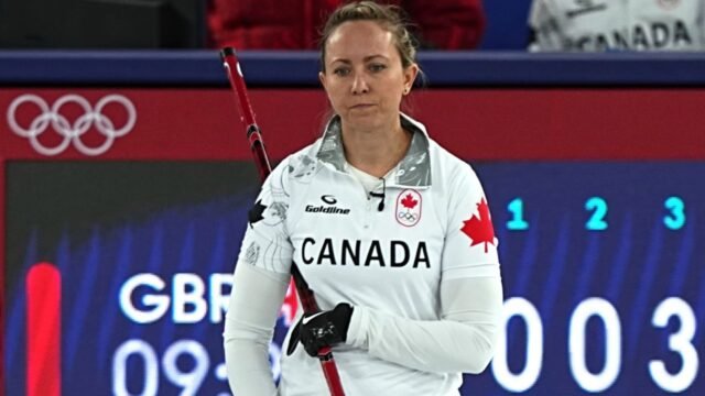 加拿大選手雷切爾·霍曼在周六對陣瑞士的第一場比賽中,因裁判吹罰犯規而被移走第一塊石子。