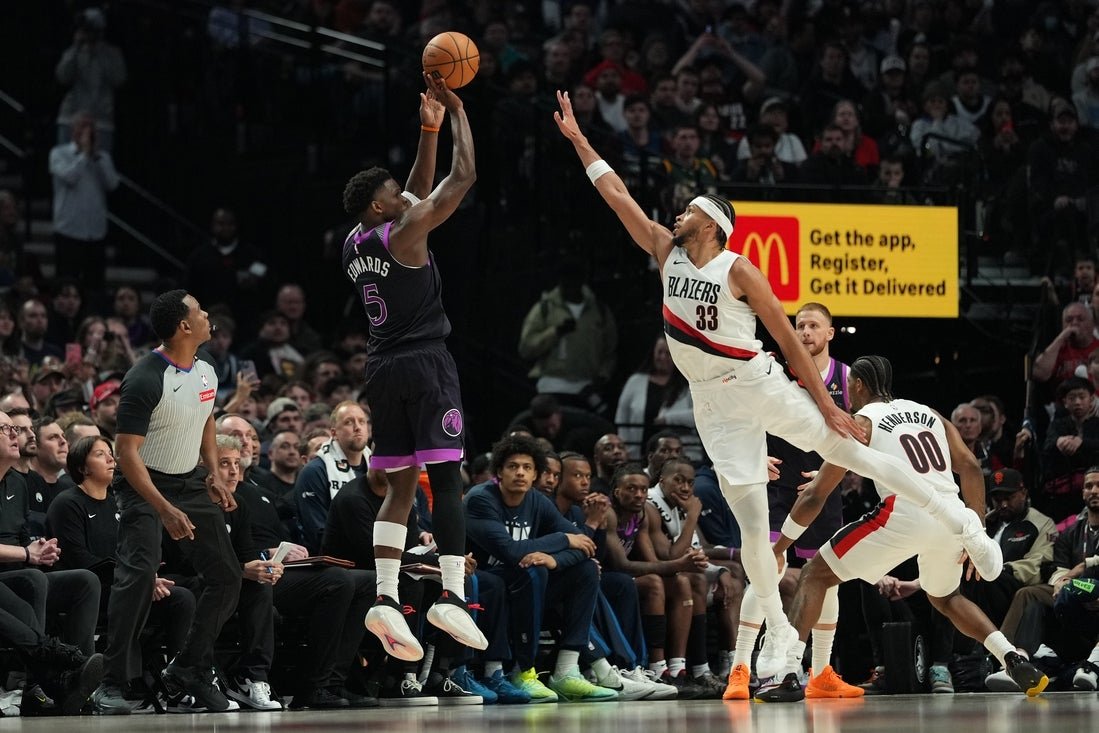 在周二三場客場之旅的首場比賽中,明尼蘇達隊以 124-121 擊敗波特蘭拓荒者隊,得到 34 分。賈登麥克丹尼爾斯三分球 6 投 5 中,拿下 29 分,僅比賽季最高分低 1 分。