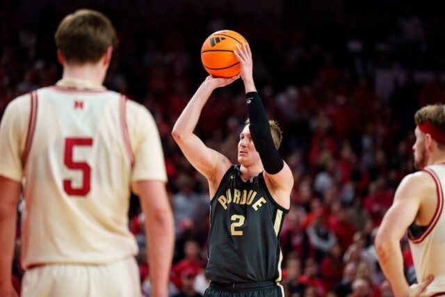 2026 年 2 月 10 日;美國內布拉斯加州林肯;普渡大學鍋爐製造商隊後衛弗萊徹·洛耶 (2) 在平尼高銀行球館下半場對內布拉斯加州玉米殼隊前鋒布雷登·弗雷格 (5) 和後衛薩姆·霍伊伯格 (1) 罰球。強制信用:Dylan Wiser-Imagon Image