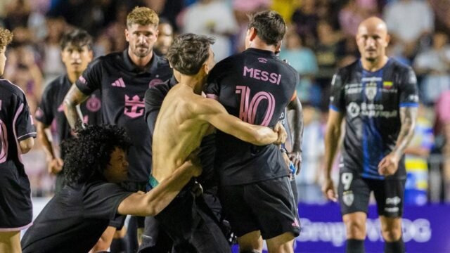 週四,邁阿密國際隊在巴亞蒙對陣厄瓜多爾山谷獨立隊時,一名球迷跑到中圈,抓住梅西的腰,將兩人拖到保安下方。