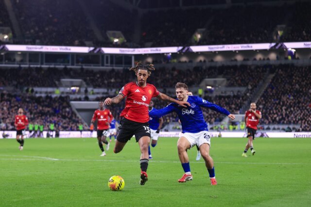 蘭尼·約羅(Lenny Yoro)最終宣布自己成為英超中後衛,他在希爾·迪金森體育場(Hill Dickinson Stadium)對陣曼聯隊的 15 號球員詹姆斯·塔爾科夫斯基(James Tarkowski)。