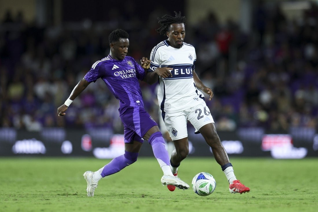 2025 年 10 月 11 日;美國佛羅里達州奧蘭多;奧蘭多城前鋒伊万·安古洛(Ivan Angulo,77 歲)和溫哥華白帽隊中場球員讓-克洛德·恩甘多(Jean-Claude Ngando,26 歲)在國際米蘭體育場下半場爭奪球權。強制信用:Nathan Ray Seebeck-Imagon Image