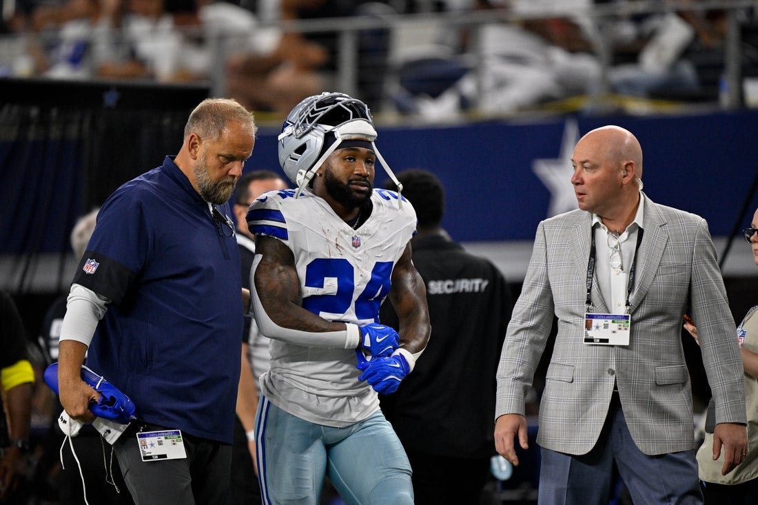 2025 年 9 月 28 日;美國德克薩斯州阿靈頓;比賽期間,達拉斯牛仔隊與球隊工作人員一起在 AT&T 體育場落後於邁爾斯·桑德斯 (24) (24) 達拉斯牛仔隊和綠灣包裝工隊。強制信用:Jerome Miron-Imagan 圖片