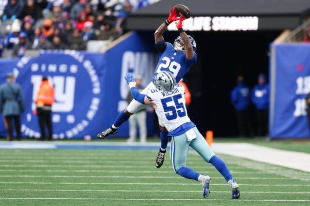 2026 年 1 月 4 日;東盧瑟福,新澤西州,美國;達拉斯牛仔隊線衛洛根·威爾遜(Logan Wilson,55 歲)在大都會人壽體育場第四節搶斷了紐約巨人隊跑衛小泰倫·特雷西(Tyron Tracy Jr.,29 歲)的傳球。強制信用:Vincent Carchietta-Imagn Images