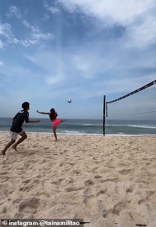 米利託的妻子泰娜·卡斯特羅·米利塔(Tayna Castro Millita)在玩沙灘鞋時也展示了她的技巧 – 基本上是排球,但使用腳和足球。