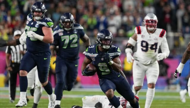 跑回來 肯尼思·沃克三世 表現並不出色,但他表現穩定,27 次沖球推進 135 碼,並獲得了 MVP 榮譽。那是捆綁的 瑟曼·托馬斯 超級碗排名第八。沃克還接住了兩次傳球,推進了26碼。