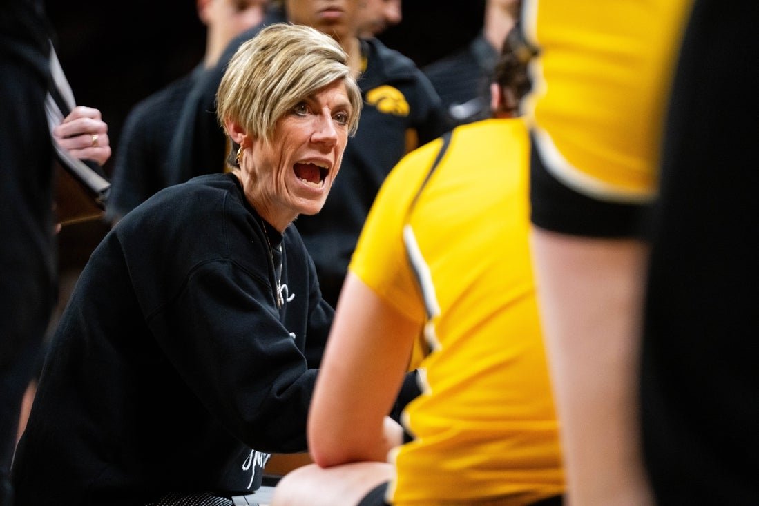 2026 年 2 月 5 日,愛荷華州主教練揚·詹森在卡弗-鷹眼體育場對陣明尼蘇達州的比賽暫停期間與球隊交談。