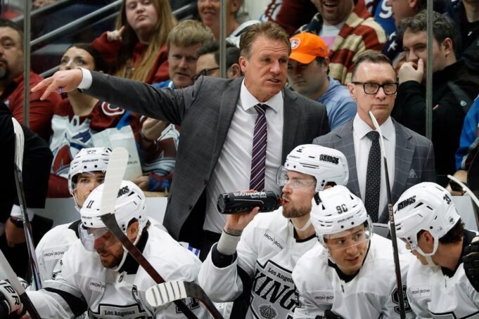 2025 年 3 月 27 日;美國科羅拉多州丹佛市;洛杉磯國王隊主教練吉姆·希勒在球館對陣洛杉磯國王隊的第一節比賽中。強製圖片來源:Isaiah J. Downing-Imagn Images