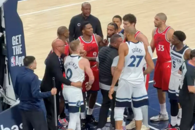 接下來,克里斯鄧恩(Chris Dunn)生氣了,試圖將麥克丹尼爾斯推開。但這位狼隊球星堅持住了,差點把鄧恩摔倒在地。唐特·迪文森佐很快介入。事實上,兩支球隊的球員、教練甚至官員都必須介入平息事態。朱利葉斯·蘭德爾不得不帶著他的隊友到球場的另一端。