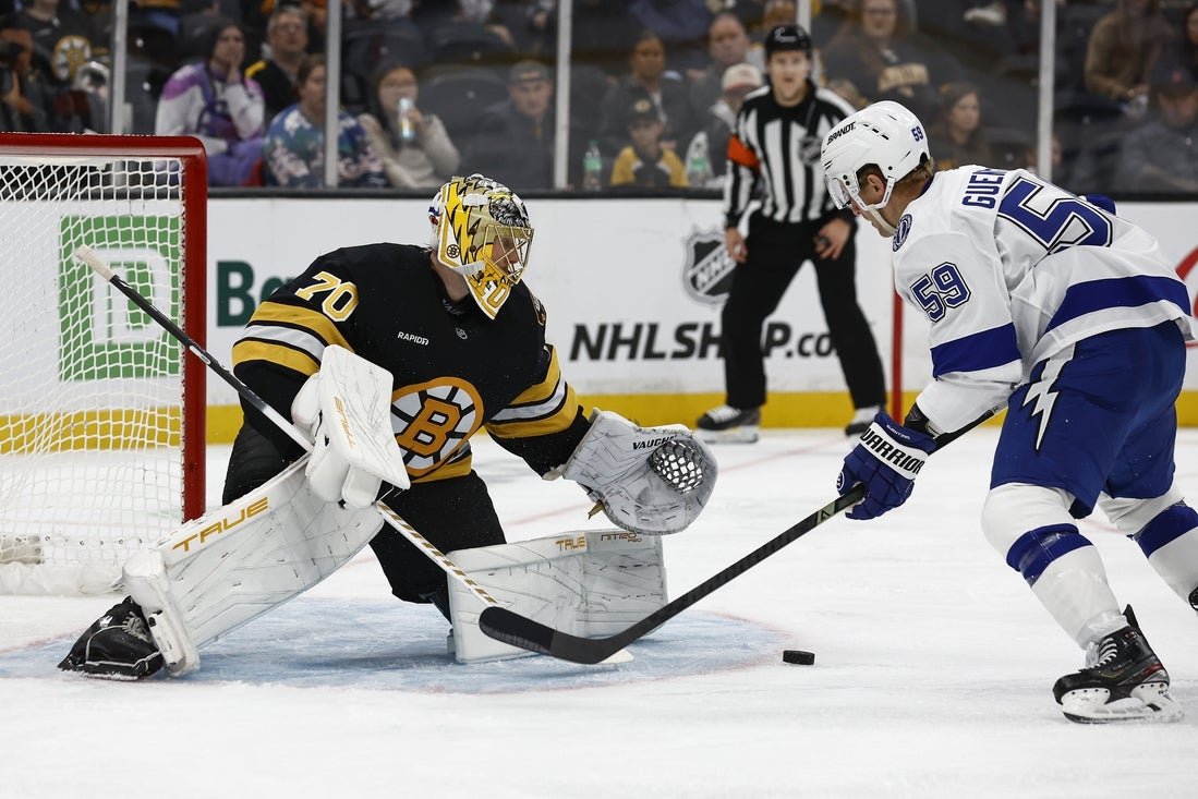 2025 年 10 月 13 日;美國馬薩諸塞州波士頓;坦帕灣閃電中心傑克·岡澤爾 (Jack Guentzel) (1) 第一次在 TD Garden 球場上時,正在波士頓棕熊隊 (Boston Bruins) 門將朱納斯·科皮奧 (Junas Corpio) () 1) 面前尋求回歸。強制信用:Winslo Townson-Imagan 圖片