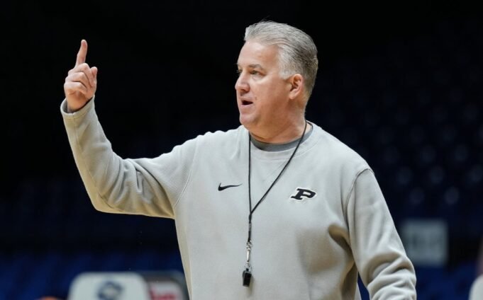 2021 年 3 月 2 日,帕爾杜鍋爐製造商隊主教練馬特·佩因特 (Matt Painter) 在印第安納波利斯盧卡斯石油體育場對陣休斯頓庫格斯隊的瘋狂錦標賽比賽訓練前與球員們進行了交談。