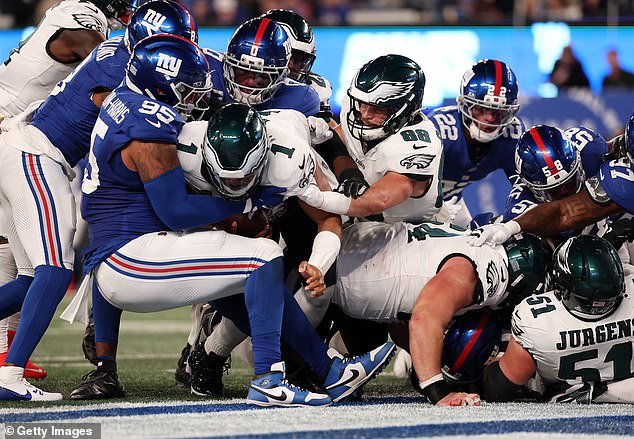 費城 Ag Gols 賈倫·哈茨 (Jalen Hearts) 猛推衝過圓線達陣