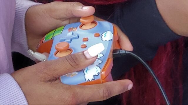 傑克遜維爾佩斯女孩中心的一名學生在揭曉警長辦公室新的行動遊戲中心設施後,使用控制器與警察一起玩電玩。